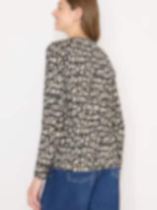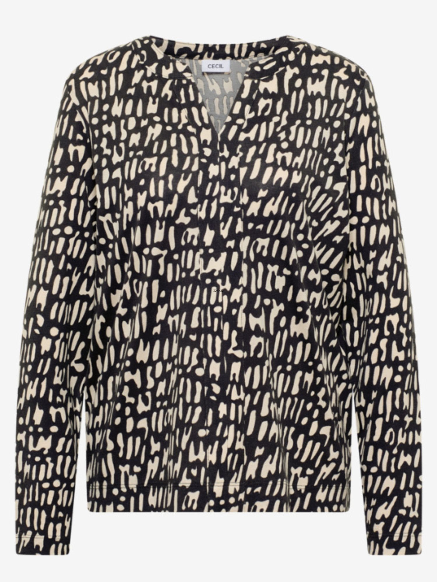 Denna moderna blust från CECIL är designat med ett grafiskt mönster som ger ett stilrent och uppdaterat uttryck. Plagget är tillverkat i en mjuk blandning av bomull och modal med stretch, vilket gör det följsamt och skönt att bära hela dagen. Split neck-halsringningen och den diskreta frontdetaljen tillför en elegant och genomtänkt detalj. Med långa ärmar och en avslappnad passform är denna blus ett perfekt val för vardag och fritid. Ett mångsidigt plagg som enkelt kan kombineras med allt från jeans till mer dressade byxor för en modern och bekväm stil.