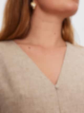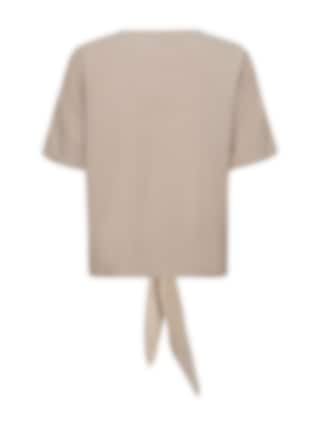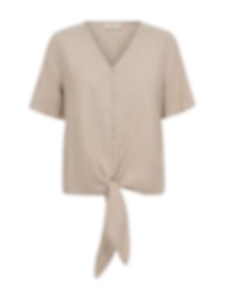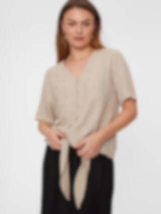 Luftig knytblus i linne- och viskosmix med v-ringning, kort ärm och klädda knappar – en stilren favorit för varma dagar. SAND MELANGE