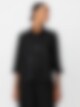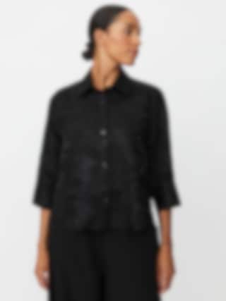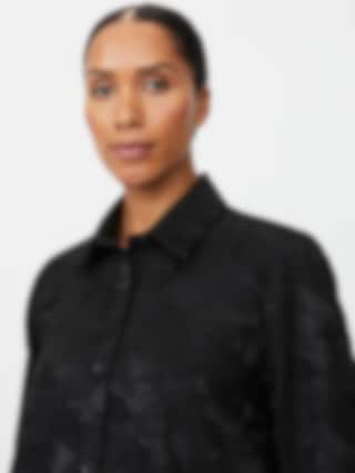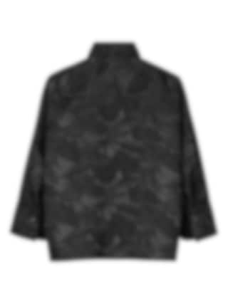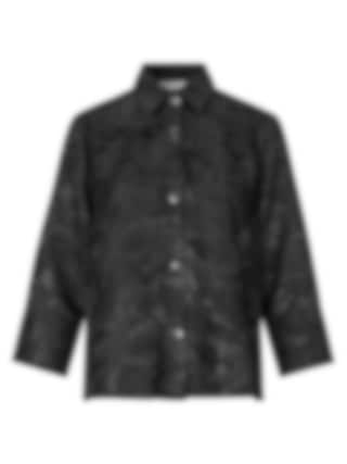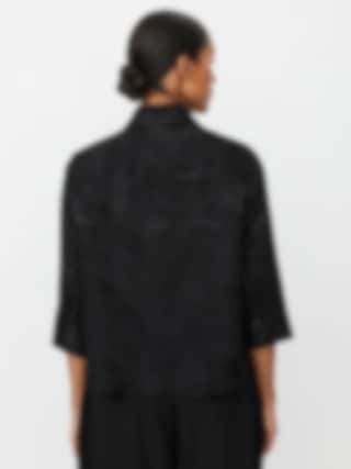 Elegant svart jacka med vävt blommönster, skjortkrage och vida trekvartsärmar. Perfekt att bära både stängd som en stilfull topp eller öppen som en lätt jacka.