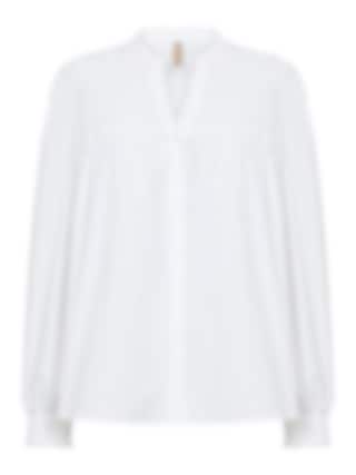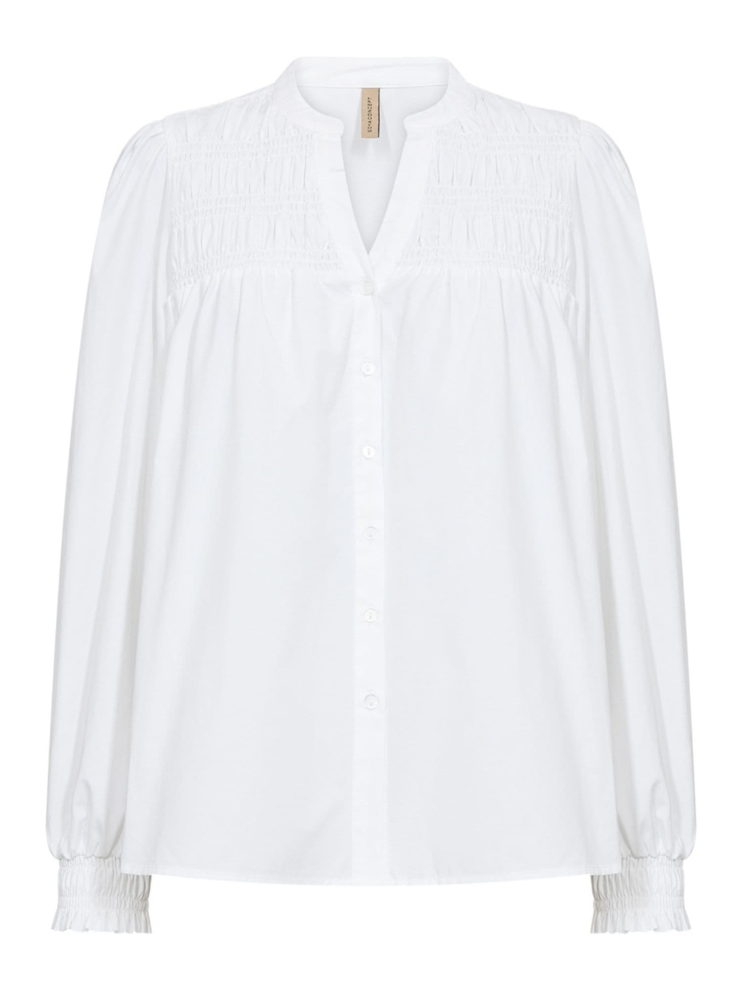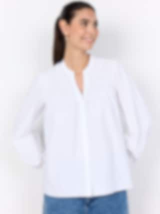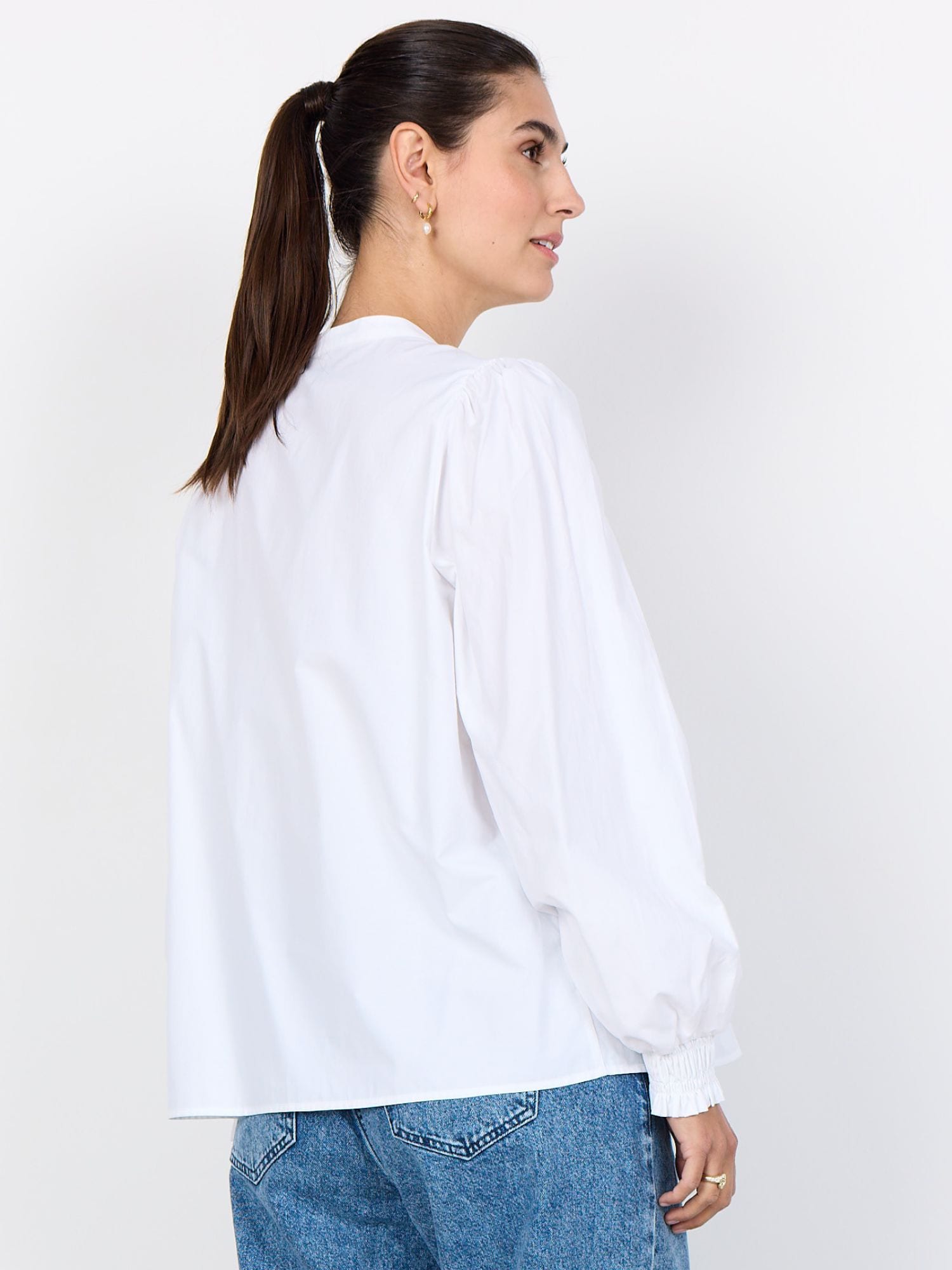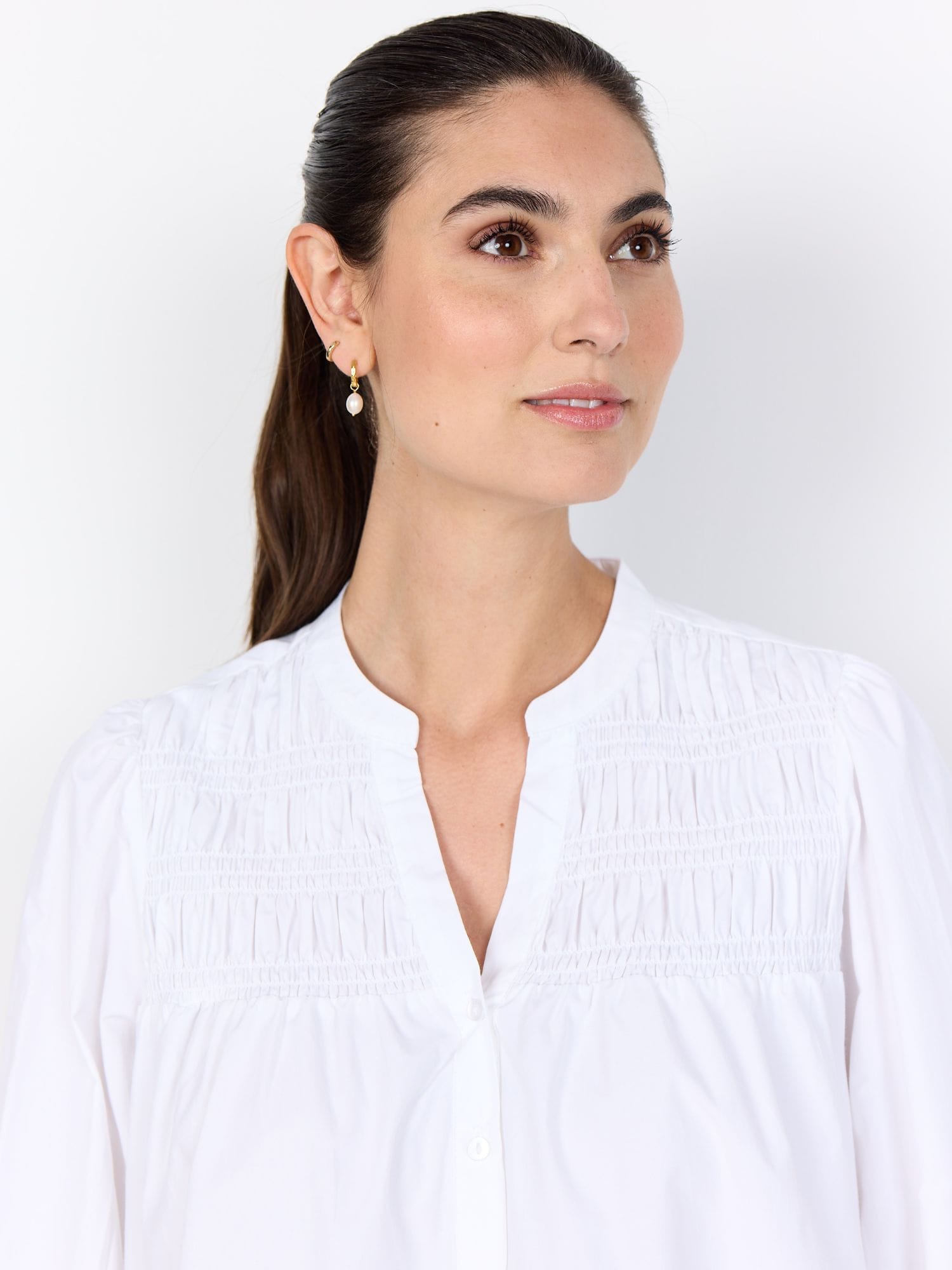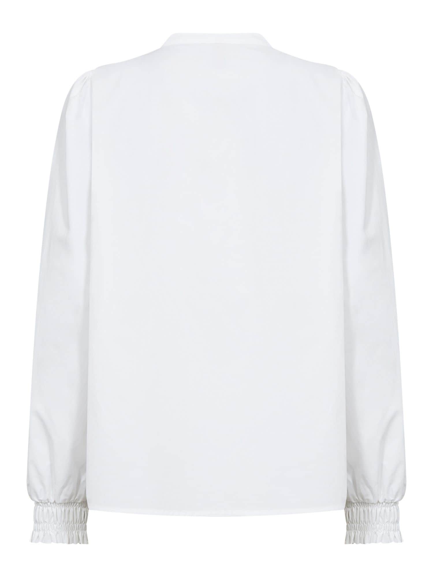 SC-NETTI 116 är en stilren blus med V-ringad krage, knappslå och eleganta rynkdetaljer. Perfekt att styla med både byxor och kjol för en tidlös och feminin look.