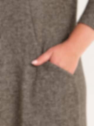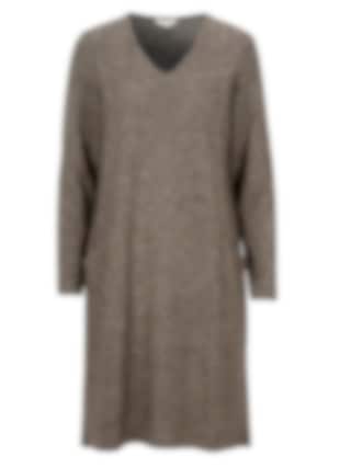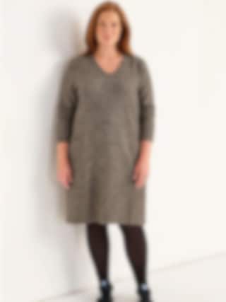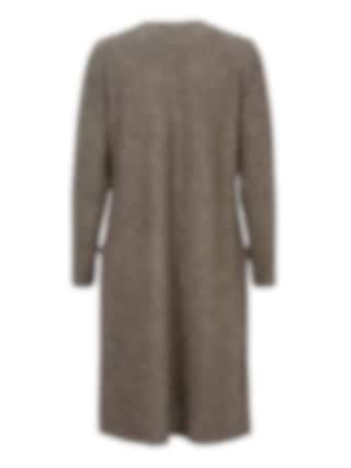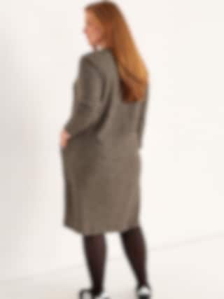 Bekväm och stilren klänning i mjukt, stretchigt stickat material. V-ringad modell med långa ärmar, djupa fickor och rundad nederkant. Tillverkad av återvunnen polyester – ett hållbart val med tidlös design.