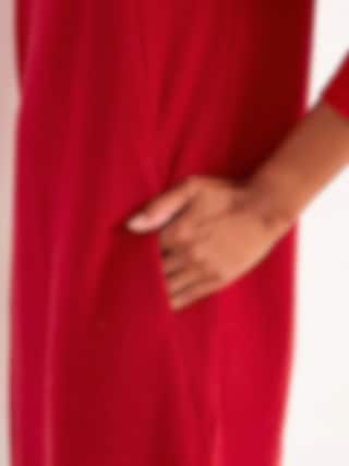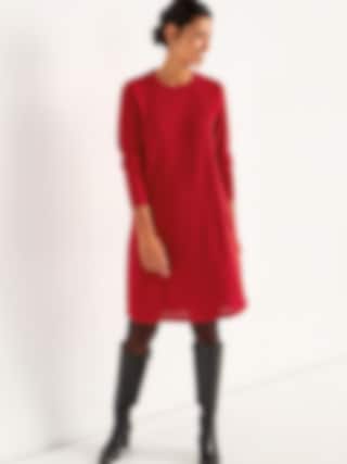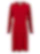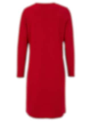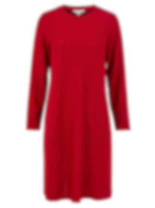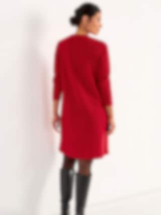 Mjukt ribbad, stretchig stickad klänning i lätt A-linjeform med rund halsringning och dekorativa snedställda sömmar fram. Dolda fickor och långa raka ärmar.