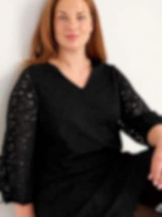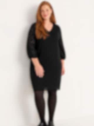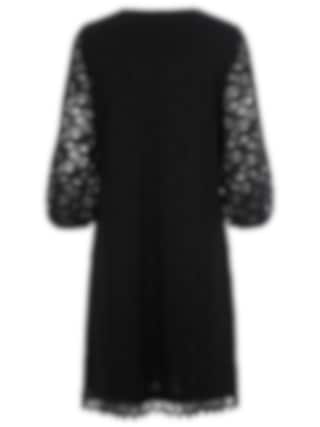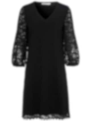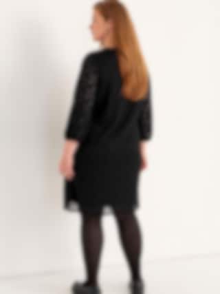 Elegant spetsklänning i stretchig kvalitet med V-ringning, rak modell och följsamt trikåfoder. Trekvartsärmar med resår och spetsdetalj nertill.
