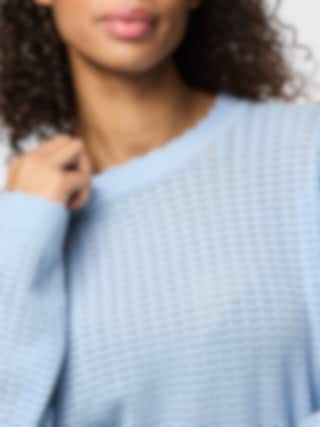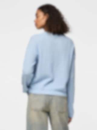 En klassisk stickad tröja med rund hals och långa ärmar. Tröjan har ribbade muddar och en mjuk, bekväm passform – perfekt för både en avslappnad och trendig look. CASHMERE BLUE