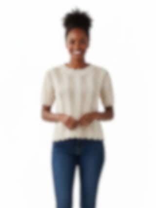 Stickad tröja i mjuk bomull med trekvartslånga ärmar och elegant strukturmönster. En tidlös favorit för både vardag och fest.