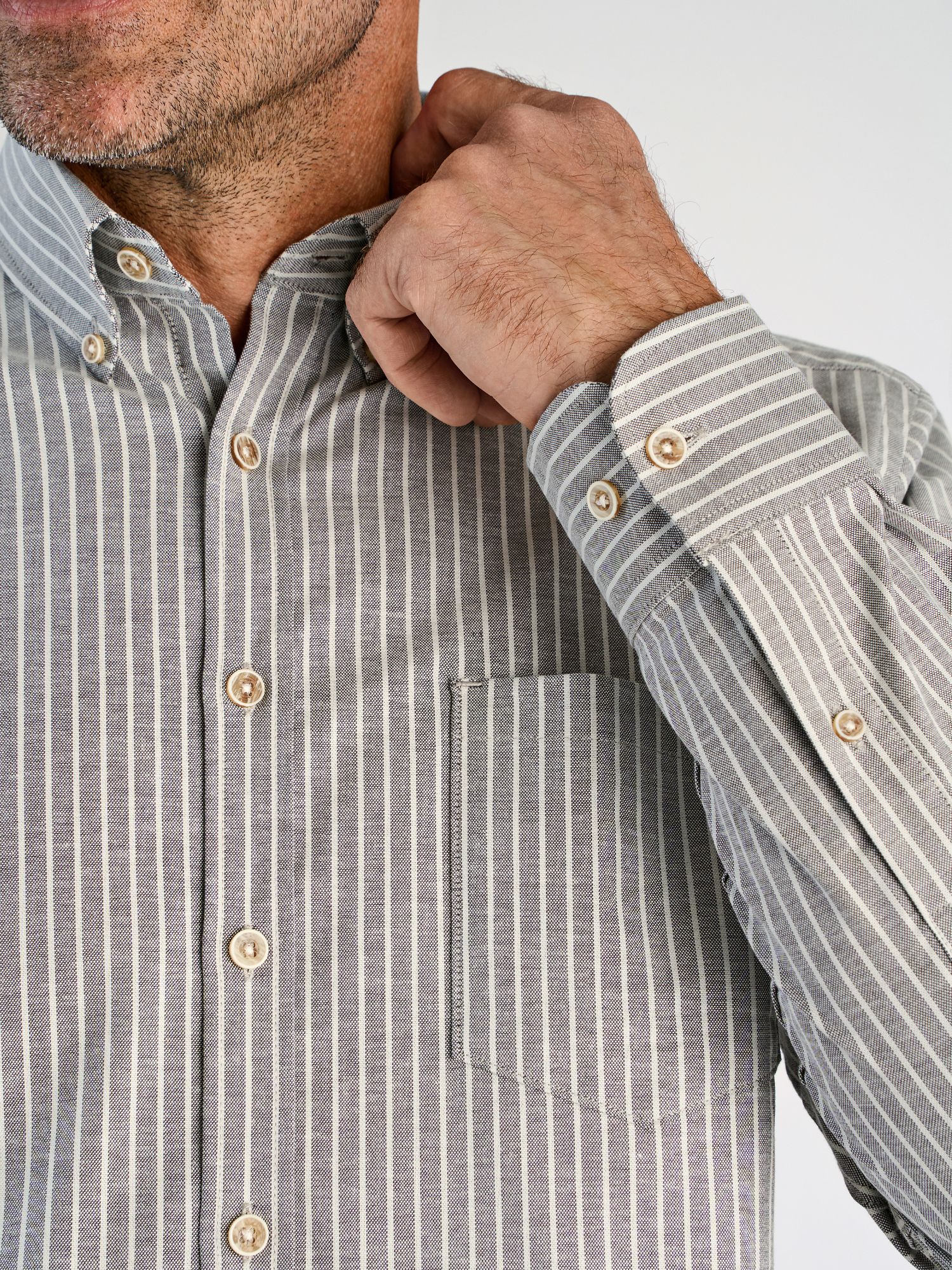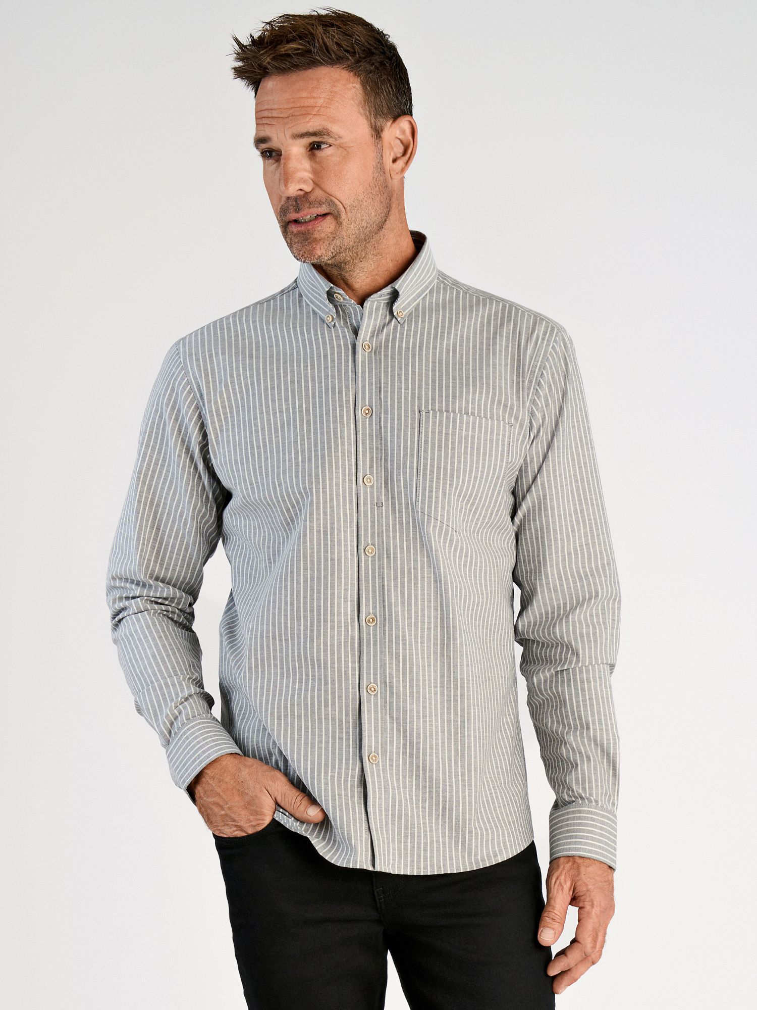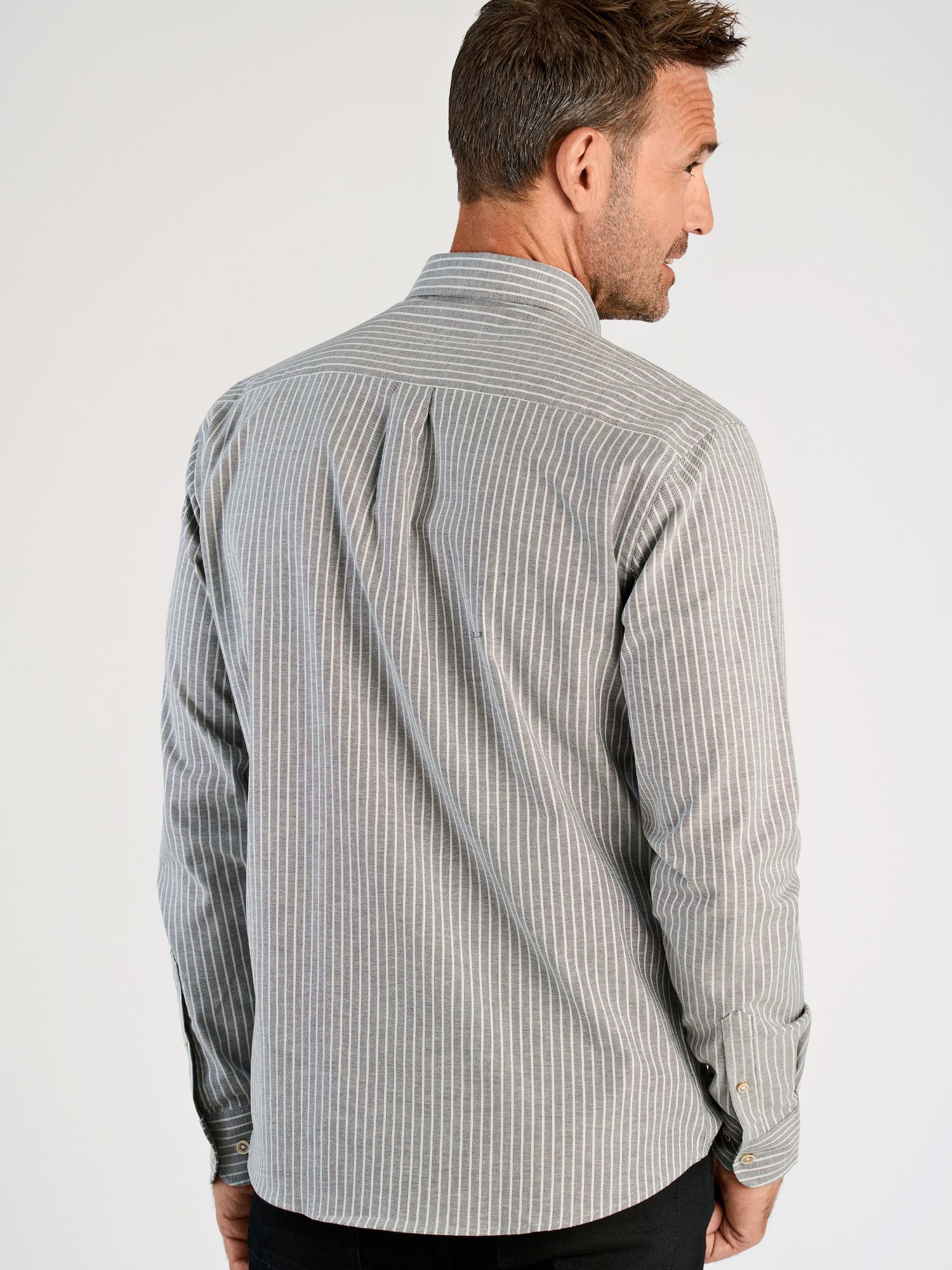 Elegant herrskjorta från Murrey i grått med vita vertikala ränder. Skjortan har knappkrage, lång ärm och en bröstficka, perfekt för både vardag och kontor.