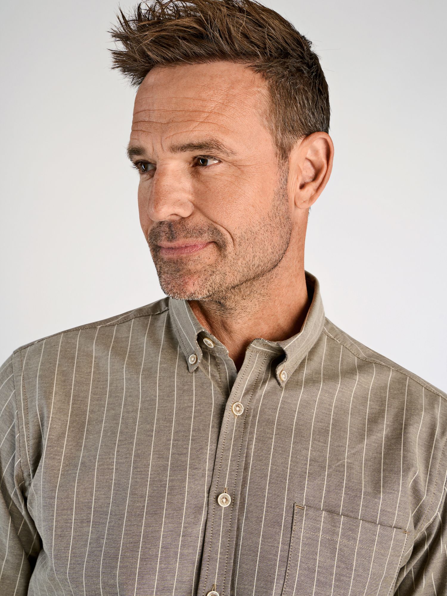 Elegant herrskjorta från Murrey i brun med vita vertikala ränder. Skjortan har knappkrage, lång ärm och en bröstficka, perfekt för både vardag och kontor.