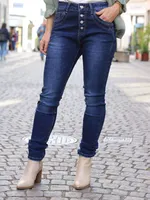 Trendiga stretchjeans med fyra dekorativa knappar framtill – en bekväm och stilfull byxa för vardag och fest.