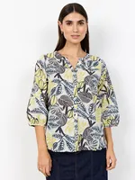 SC-CAM 2 är en stilren blus i 100% ekologisk bomull med rund halsringning, knappslå och ett livfullt bladtryck. Perfekt för både vardag och mer uppklädda tillfällen.