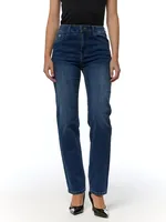MiAmori-jeans i mörkblå tvätt med hög midja och vidare passform – mjuka, stretchiga och bekväma med en stilren look för vardag och jobb.
