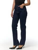 MiAmori-jeans i en riktigt mörkblå tvätt med hög midja och vidare passform – stilrena, moderna och stretchiga, perfekta för vardag och jobb.