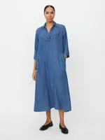 Mjuk och bekväm denimklänning från Masai med en elegant, feminin känsla. Den har skjortkrage, djup V-ringning och ett avslappnat A-linjeformat snitt som faller fint över kroppen. Lätt att styla både upp och ner – perfekt för både vardag och mer uppklädda tillfällen.
