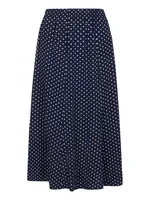 Marinblå vadlång kjol i mjuk viskos med vita prickar. Lätt utställd modell med resår i midjan och horisontella sömmar som ger fin vidd.
