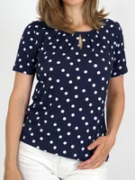 Mjuk topp i marinblått med vita prickar från M.X.O. Rund hals, kort ärm och dekorativa veck fram – perfekt för både vardag och fest.