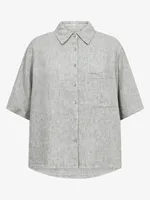 Denna stilrena skjorta från Freequent är tillverkad i en mjuk och luftig vävd linblandning med smala, garnfärgade vertikala ränder som ger ett tidlöst uttryck. Skjortan har en lös, rak silhuett med klassisk krage och knappslå, raka trekvartsärmar och en praktisk bröstficka. Perfekt för både avslappnade vardagsstilar och lättare lager på kontoret.