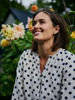 Söt blus från Freequent i mjukt material med prickigt mönster. V-ringning, trekvartsärmar och knappslå med dekorativa bakveck.