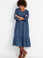 Vävd denimklänning i lös passform med rund halsringning och knappstängning baktill. 3/4-ärmar med resår och dekorativ volangkant ger en feminin touch.