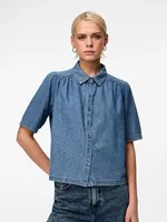 Feminin jeansskjorta från Pieces i mediumblå denim med kort ärm och avslappnad passform. Den tvättade finishen ger ett tidlöst och somrigt uttryck.