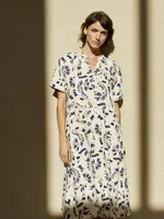 En luftig och feminin klänning från MASAI i ett vackert blomstertryck. Den mjuka blandningen av viskos och linne ger en sval och behaglig känsla, perfekt för varma sommardagar. Med djup V-ringning, dekorativa knappar och praktiska sidofickor är den både stilfull och bekväm.