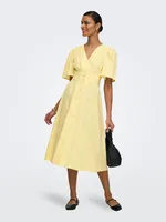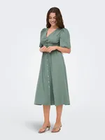 Denna klänning är ett stilfullt och mångsidigt val som passar för alla tillfällen och säsonger. Den är designad med en smickrande v-ringning och 2/4 långa ärmar som ger en elegant och balanserad silhuett. Knäppningen med knapp och hyska framtill tillför en fin detalj och gör klänningen enkel att ta på. Midilängden skapar ett tidlöst uttryck, medan regular fit-passformen ger både komfort och en avslappnat sofistikerad look. Perfekt att bära både till vardag och vid mer uppklädda tillfällen.