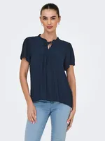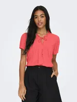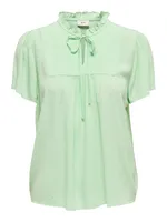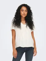 Denna eleganta blus är det perfekta tillskottet till din vardagsgarderob. Tillverkad i mjuk och lätt viskos, ger den en lyxig känsla med sin silkesliknande yta och vackra drapering. Blusen har en smickrande V-ringning och korta volymärmar som tillför en feminin touch. Knytdetaljen ger en extra stilfull känsla och gör den lätt att styla både till vardags och fest. Med sin lösa passform är den både bekväm och chic – en mångsidig favorit för varje modeintresserad kvinna.