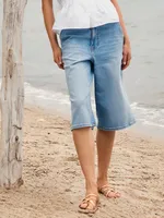 Shortsen är designade med hög midja, bälteshällor och klassisk knäppning framtill, vilket skapar en smickrande silhuett. De sneda sidofickorna tillsammans med bakfickorna förstärker den ikoniska denimstilen, medan de vida benen och den något längre längden bidrar till en elegant och avslappnad passform.