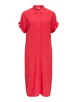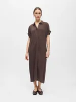 Denna skjortklänning är ett mångsidigt plagg med en feminin känsla som passar för alla tillfällen. Den kan enkelt stylas för vardagen med sneakers för en avslappnad look, eller kläs upp med klackar och accessoarer för ett mer elegant och festligt uttryck. Klänningen är tillverkad i vävt material, vilket gör den slitstark och stabil, samtidigt som det ger ett klassiskt och prydligt utseende – perfekt även för kontorsbruk. Designen har en traditionell skjortkrage, korta ärmar och knäppning framtill, vilket ger ett tidlöst och stilrent intryck. Den är ofodrad och har en normal passform som gör den bekväm och lätt att bära hela dagen.