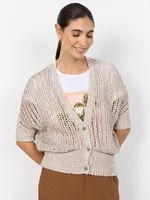 Stickad cardigan från Soya Concept i ekologisk bomullsblandning. Designad med V-ringning, knäppning framtill och dekorativt hålstickat mönster. En stilren modell som enkelt lyfter både vardags- och jobblooks.