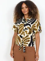 Elegant skjorta från Soya Concept i mjuk ECOVERO™-viskos. Designad med klassisk krage, korta ärmar och en trendig knytdetalj framtill. Det grafiska mönstret ger en modern touch – perfekt för både jobb och vardag.