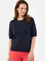 Mjuk och stilren pullover från Brandtex i finstickad viskosblandning. Kort ärm och nätta muddar i ärmslut och nertill ger en elegant finish, medan det diskreta mönstret fram på bröstet tillför en subtil detalj som lyfter plagget. Perfekt för både vardag och lite finare tillfällen – en bekväm och chic topp som är lätt att styla.