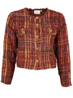 Denna exklusiva jacka kombinerar klassiskt mönster med modern elegans. Den korta silhuetten och det sofistikerade rutiga tyget gör den till ett statement-plagg som enkelt kan stylas upp eller ner. Jackan har rund halsringning, dekorativa fickdetaljer och vackra knappar framtill som förstärker den lyxiga känslan. Perfekt att bära över en klänning till fest eller med jeans och boots för en chic vardagsstil. Den tidlösa designen gör jackan till ett nyckelplagg i garderoben, en investering i både stil och kvalitet.