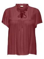 Denna eleganta blus är det perfekta tillskottet till din vardagsgarderob. Tillverkad i mjuk och lätt viskos, ger den en lyxig känsla med sin silkesliknande yta och vackra drapering. Blusen har en smickrande V-ringning och korta volymärmar som tillför en feminin touch. Knytdetaljen ger en extra stilfull känsla och gör den lätt att styla både till vardags och fest. Med sin lösa passform är den både bekväm och chic – en mångsidig favorit för varje modeintresserad kvinna.