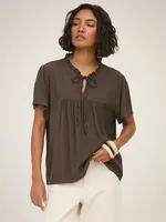Feminin och stilren blus i mjuk viskos med en vacker drapering. Designad med en smickrande V-ringning, korta volymärmar och en elegant knytdetalj för en luftig och modern look.