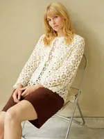 Krämfärgad kofta från Masai i mjuk, virkad bomull med romantiskt blommönster. Den raka passformen och tre knappar framtill gör den både klassisk och mångsidig – perfekt som ett lätt lager för en avslappnad, feminin sommarlook.