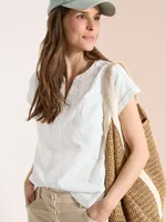 Luftig blusskjorta från Cecil i ren bomull med delad halsringning och nedsänkta axlar. Det tonala broderimönstret ger en modern, somrig känsla – perfekt för avslappnade dagar i solen.