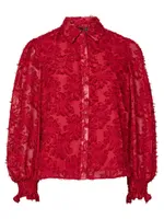 Elegant röd skjorta från PIECES i vackert jacquardtyg med diskret mönster. Tillverkad av 100% återvunnen polyester med knappstängning och elastiska ärmslut – perfekt för både vardag och fest. SAVVY RED