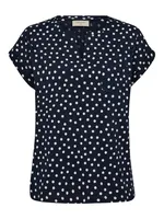 Denna topp är ett charmigt tillskott till garderoben, perfekt för dig som vill addera lekfullhet och retroinspirerad stil till vardagslooken. Det täta prickmönstret skapar ett piggt uttryck, medan den avslappnade passformen gör toppen lätt att bära hela dagen. Toppen har en rundad hals med v-formad slits som ger en fin inramning av ansiktet, korta ärmar med uppvik samt en diskret bröstficka som balanserar designen. Tillverkad i ett mjukt och lätt material som ger ett naturligt fall. Matcha med jeans, shorts eller kjol för en ledig men genomtänkt stil – lika fin till vardags som till lediga helgutflykter.