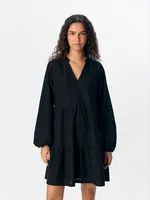 Klänningen har V-ringning som framhäver halsen och ger ett feminint uttryck, medan de långa ärmarna med elastiska manschetter ger en modern och avslappnad look. Klänningen är halvfodrad, vilket ger ett extra lager komfort och stöd.