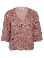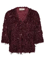 Elegant blus i sammetsmaterial med paljetter och vacker fransdetalj – perfekt för festliga tillfällen.