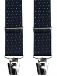 Klassiska hängslen med blanka, nickelfria spännen. Justerbar längd upp till 120 cm och 35 mm breda band. Perfekt för både vardag och fest. MARINBLÅ DOTS