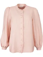 Denna svarta blus är ett elegant tillskott till garderoben. Med sina subtila volangdetaljer längs knäppningen och den runda halsringningen får blusen en feminin och sofistikerad touch. De långa ärmarna med lätt puff vid axlarna ger en modern siluett som passar till både vardag och fest. Blusen är lätt att bära och enkel att styla – kombinera den med jeans för en avslappnad men chic look, eller med kjol och klackar för en mer uppklädd outfit. Den mjuka färgen gör den tidlös och lätt att matcha med säsongens alla nyanser. En mångsidig och stilsäker blus som snabbt blir en favorit, perfekt för dig som vill känna dig både bekväm och elegant.