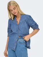 Tidlös denimskjorta med skjortkrage och puffade 3/4-ärmar. Smockade manschetter, knappknäppning och regular fit gör den perfekt för vardag, jobb eller trendiga dubbel-denim-looker.