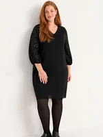 Elegant spetsklänning i stretchig kvalitet med V-ringning, rak modell och följsamt trikåfoder. Trekvartsärmar med resår och spetsdetalj nertill.