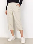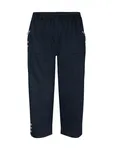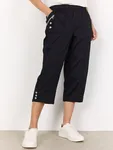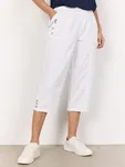 Byxan har en elastisk midja som ger hög komfort och en flexibel passform. Dragkedjefickor framtill bidrar till både funktion och modern stil, medan de dekorativa knapparna längs sidorna och vid bensluten ger plagget en genomarbetad look. Den kortare längden – klassisk caprimodell – gör den luftig och lättmatchad med allt från toppar och linnen till tunikor.