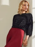 Glittrande stickad tröja i mjuk viskosblandning med trekvartsärmar och eleganta paljettdetaljer – perfekt för både vardag och fest.
