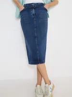 Denimkjol från CECIL med figursmickrande mid waist-passform, elastisk midja med dragsko och stretchig kvalitet. En bekväm och lättmatchad kjol för vardagens alla tillfällen.