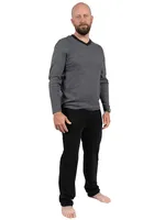 Sätt guldkant på dina nätter med denna klassiska pyjamas i 100% bomull, designad för att ge både komfort och stil året runt. Den långärmade tröjan har en tidlös randig design i svart, mörkgrått och ljusgrått som ger en modern och elegant känsla till din nattklädsel. Byxorna är enfärgade i svart och skapar en stilren kontrast som kompletterar helhetsintrycket.