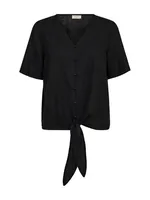 Luftig knytblus i linne- och viskosmix med v-ringning, kort ärm och klädda knappar – en stilren favorit för varma dagar. BLACK