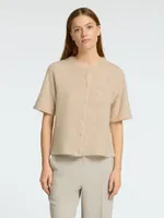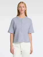 Denna cardigan erbjuder en stilren och avslappnad look med sin runda hals och 2/4 ärmar som ger ett modernt och lättare intryck. Ribbad design vid ärmsluten ger en fin detalj och förhöjer plaggets komfort. Knäppningen framtill med knappar gör det enkelt att anpassa cardiganen efter behov, och den lösa passformen gör att den sitter bekvämt utan att vara för tight, vilket gör den perfekt för både avslappnade vardagslooks och lite mer stilfulla sammanhang.
