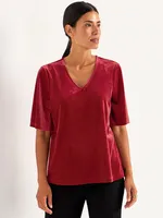 Elegant V-ringad topp i sammet med lätt glans, stretchig komfort och normal passform.